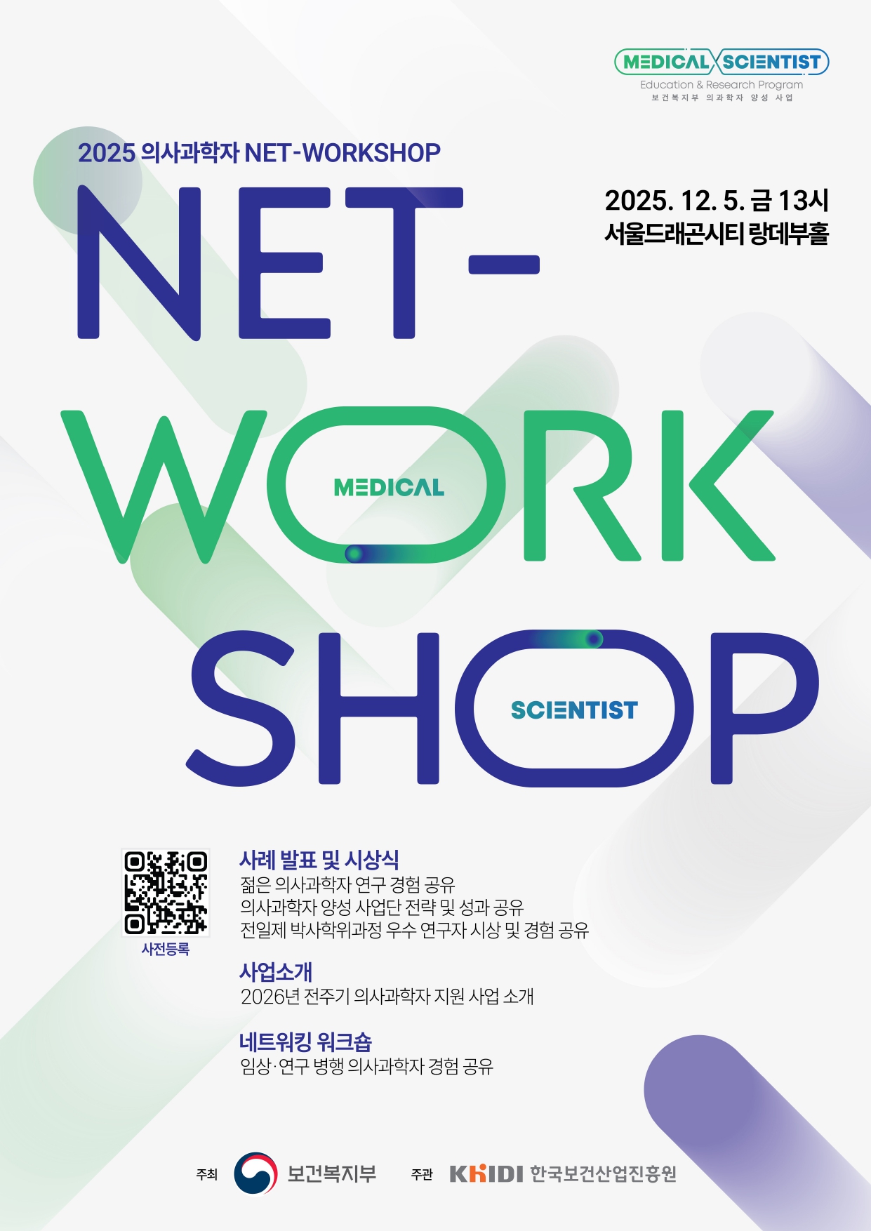 보건복지부와 한국보건산업진흥원이 주최하는 2025 의사과학자 NET-WORKSHOP이 아래와 같이 개최됩니다. 관심 있는 학생과 관계자분들의 많은 참여 바랍니다!