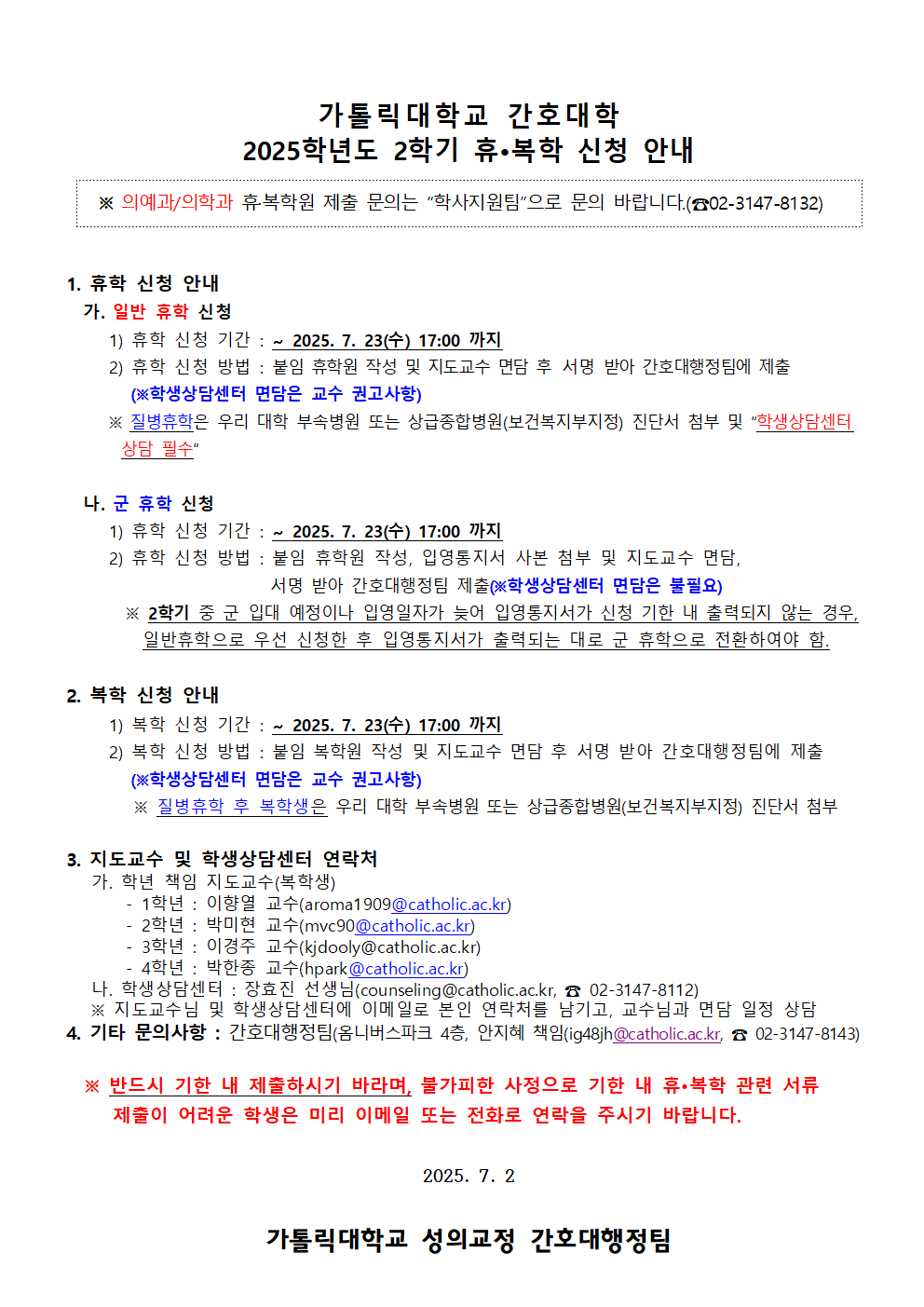 [간호대학] 2025학년도 2학기 간호대학 휴/복학 신청 안내